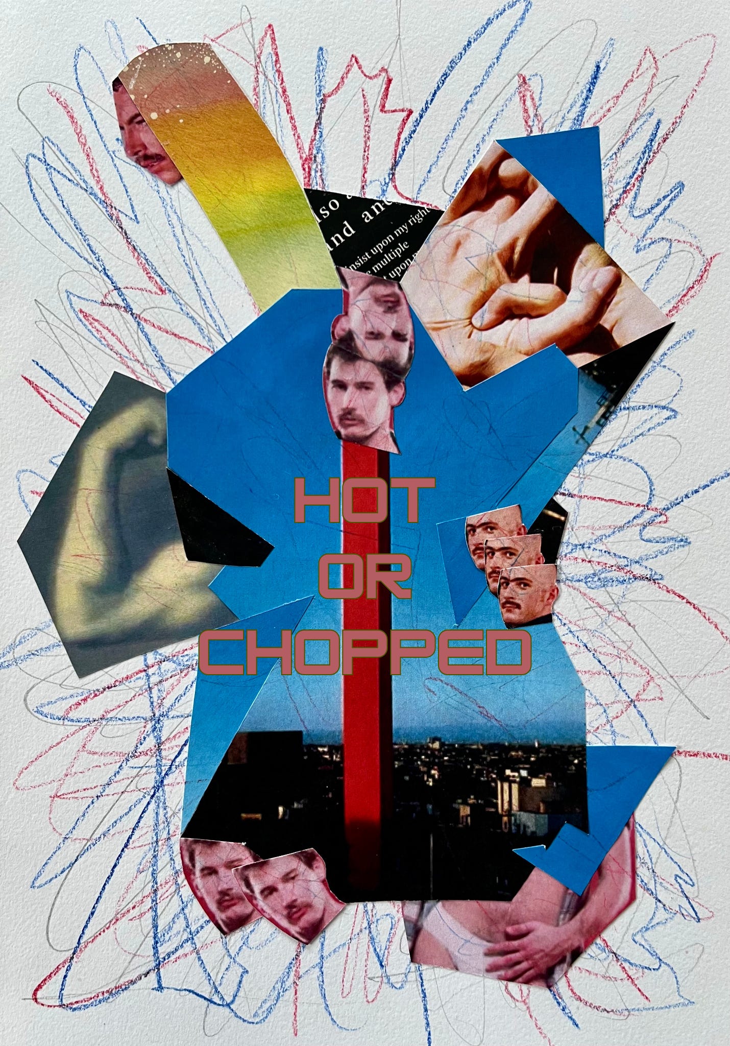 I burned a dozen times over with the wooden structure and those citizens of earth on the quest for truth. But they would not find it here. The whole wreckage of my home collapsed inward, down into the basement with all of my other bodies burning and the vat that they spawned from too. Was I hot, was I chopped, was I a government project, they’d never know. My strategies would change, trails would go cold, within days there would be a mean woman to get mad at or new invented enemies to chase to the end of loneliness. I lose battles but I win wars. They’ll build no statues of me but they’ll catch glimpses of me—on the street, in the background of a movie, on a dating app with a checkmark by one of my names—and say to their friend ‘holy shit, isn’t that the hot or chopped guy’ and their friend will say ‘everyone looks like that now, dude. It’s just some guy.’